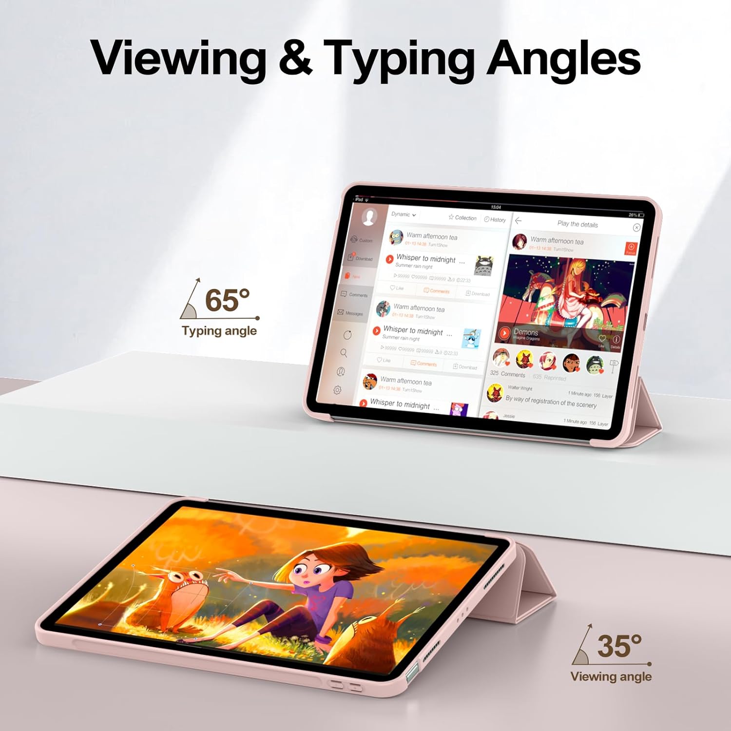 [Adjustable Angles] Tri-fold front cover features dual standing modes for viewing and keyboard typing. Support auto sleep/wake.